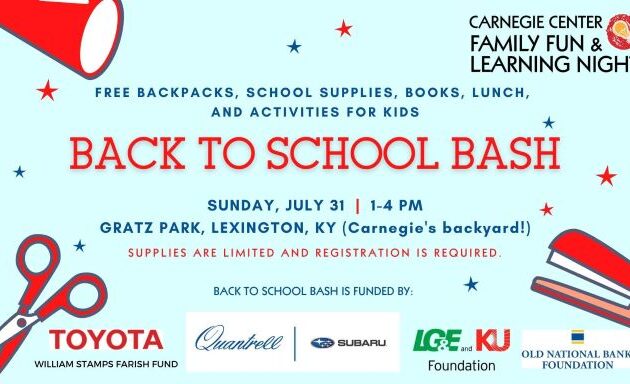 🆓 07/31/2022 1:00 pm - 4:00 pm Back to School Bash Carnegie Center for Literacy and Learning, Lexington KY