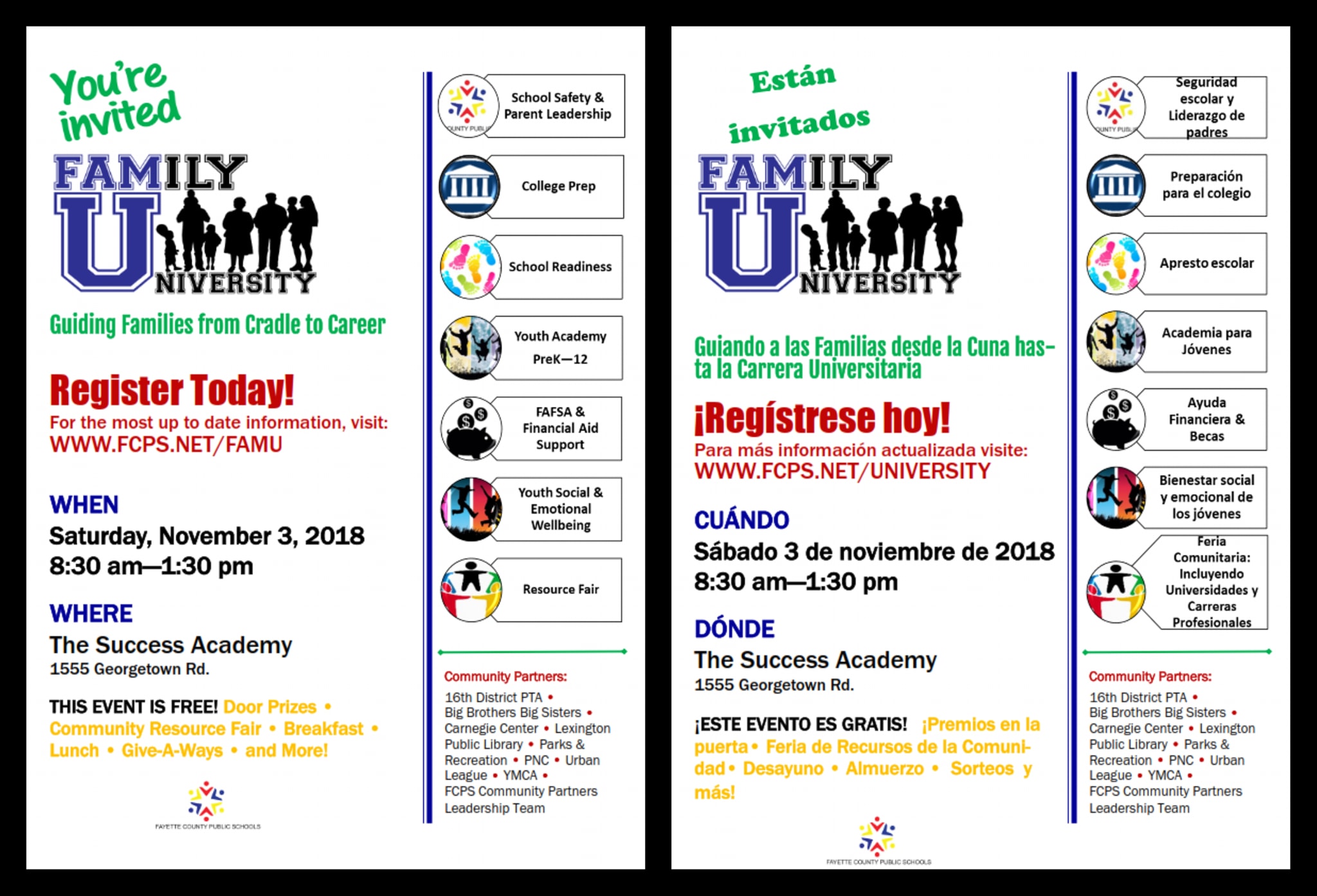 You are invited to Family University: Guiding Families from Cradle to Career on Saturday, November 3, 2018 from 8:30 am – 1:30 pm at The Success Academy (1555 Georgetown Rd).