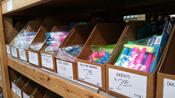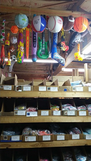 You’ll find lots of “Oriental Trading” type items here. Craft kits, prizes, stickers, pencils, tattoos, erasers, Christian themed items, sports balls, small toys, Pirate themed, Tropical themed, baby shower, as well as some gift ideas. There are rows and rows of items to choose from.