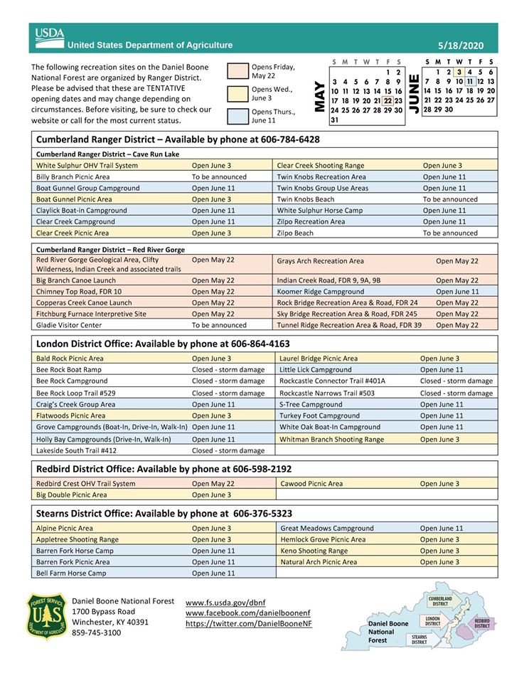 The USDA has released a tentative schedule for reopening of Red River Gorge and other recreational areas (campgrounds, picnic areas, horse camps, etc.)