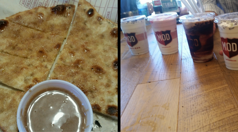 I tried the cinnamon sticks for dessert and the staff recommended the made in-house cinnamon glaze. It’s a 6 inch dough cooked with a cinnamon topping and served with a cup of glaze (strawberry, chocolate, or cinnamon) and it’s totally awesome! It’s just $2.77 and I’ll have to go back and try the strawberry and chocolate next time. They have great looking milkshakes that we heard were super yummy. You can also choose mix ins for your milkshake like cookie dough, OREO cookies, and sea salt toffee.