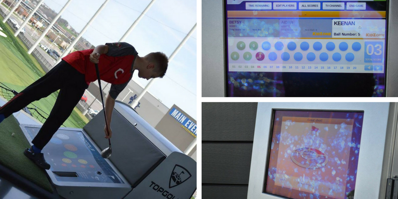In your bay there are couches, a tv for your scores and tracking hits, a tv for watching a variety of channels (we found Nick for the kids), a set of clubs for you to use, and an interactive touchscreen computer for you to use as you play. This tracks your time, who is playing, and you have to use it each time someone new steps up to hit so it tracks scores properly (if you forget like we did a few times you’ll hit a ball on someone else’s score). There are a variety of games you can play – some require more skill than others – we just chose the traditional game where you get points the farther the target is that you hit and the closer you hit the ball to the target.